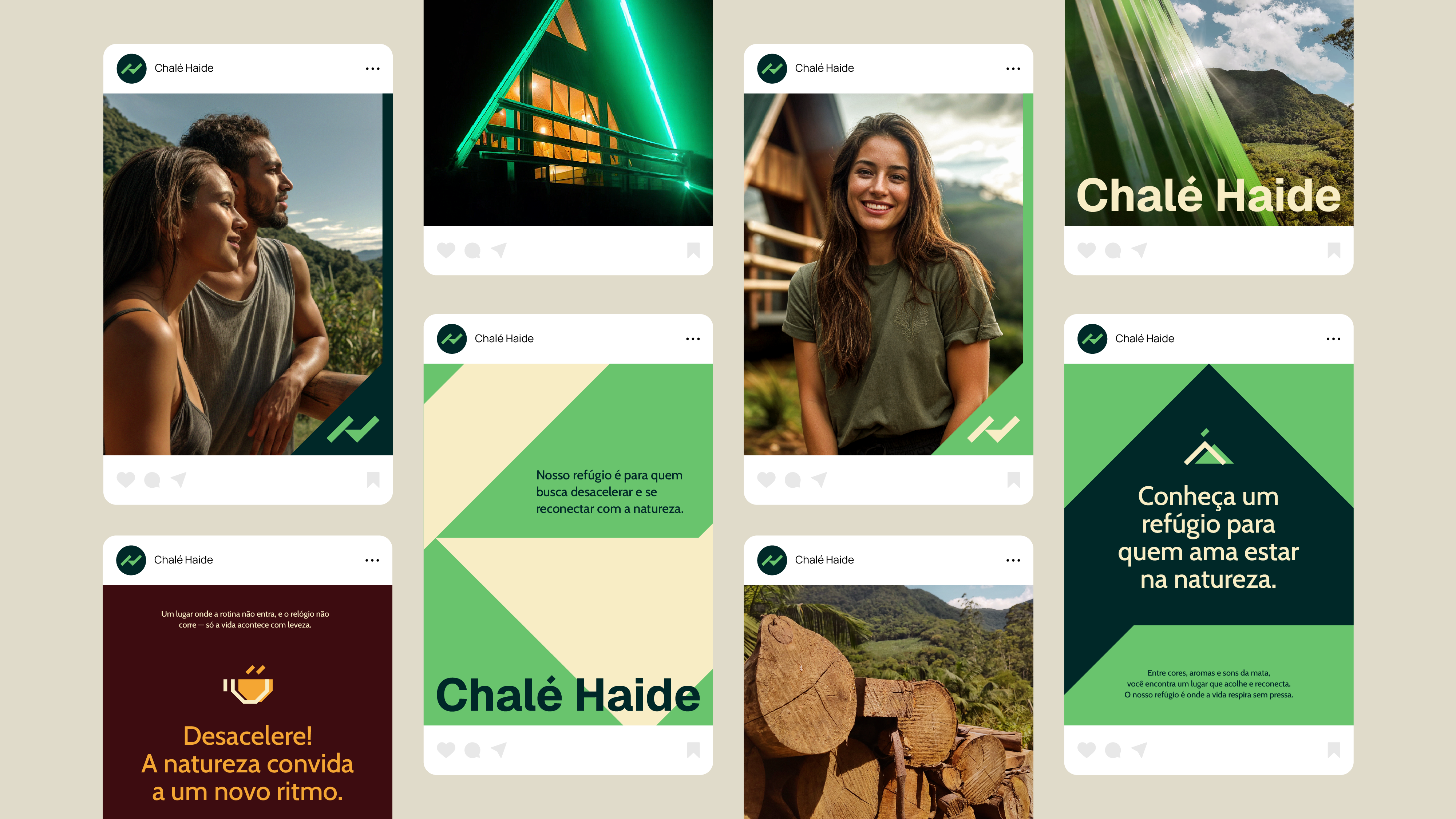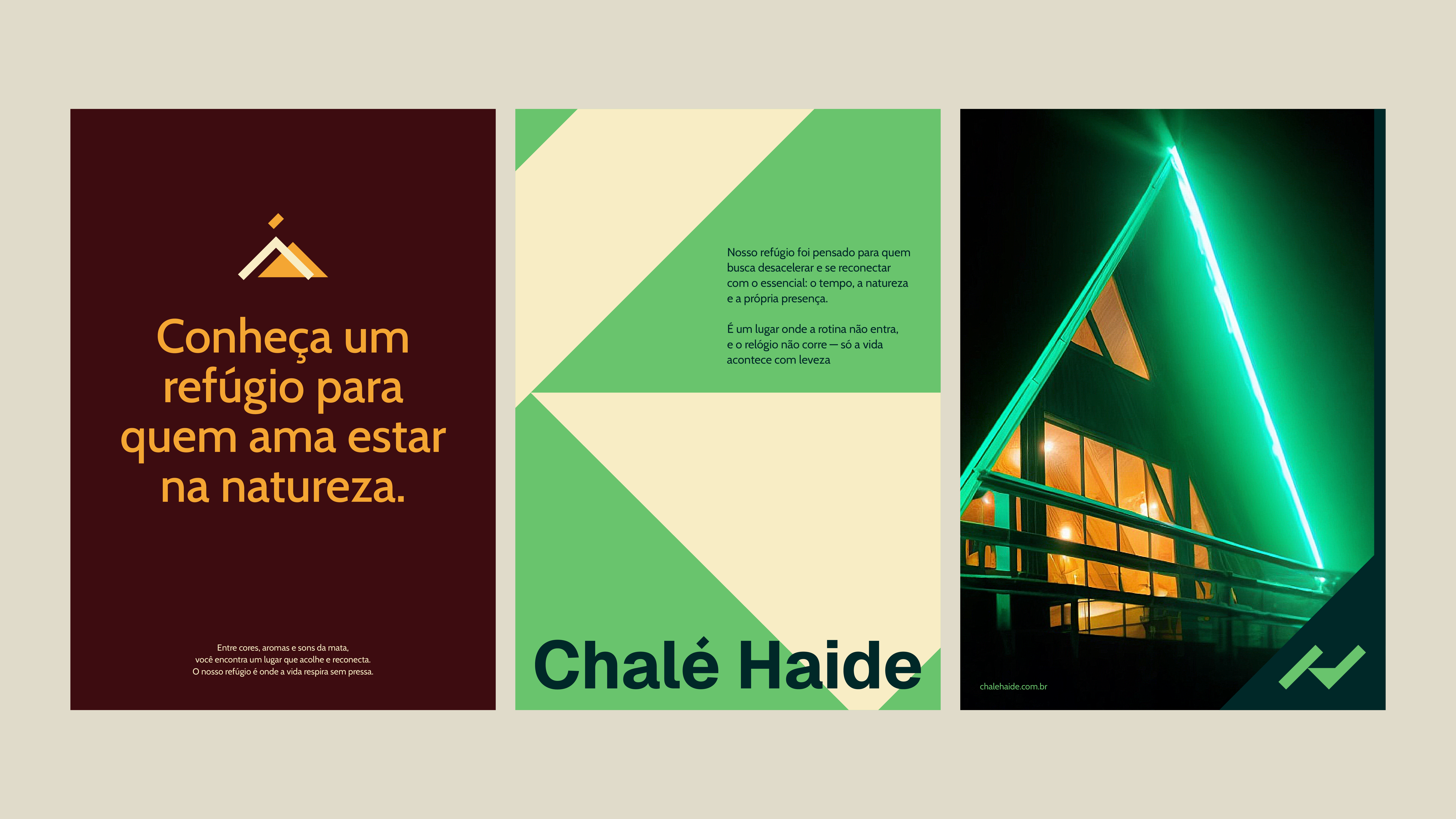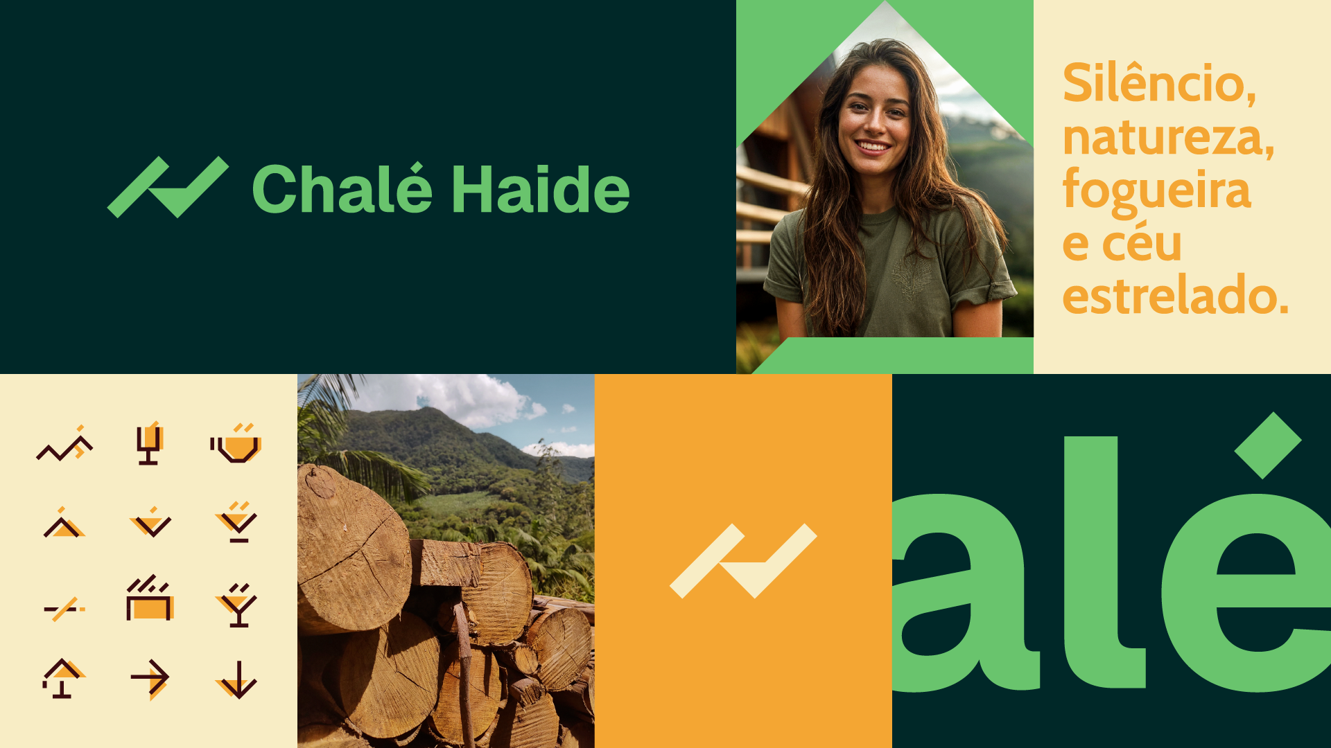Visualmente, buscamos uma construção que refletisse essa essência — formas inspiradas na própria arquitetura do chalé, cores que evocam a natureza e um tom de voz que convida as pessoas a desacelerar.